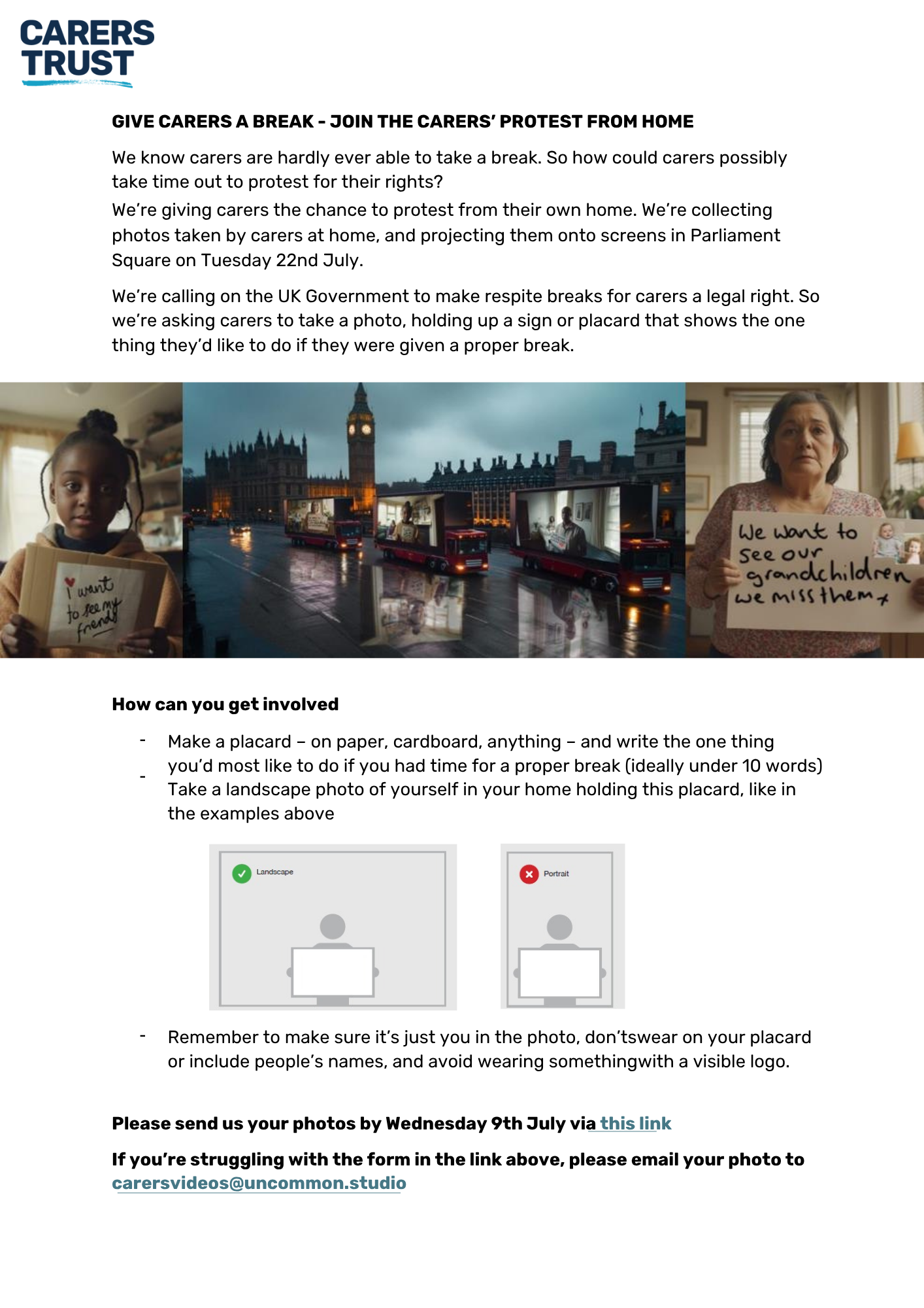 Send your photos by Wednesday 9th July via this link. If you’re struggling with the form in the link, please email your photo to carersvideos@uncommon.studio.